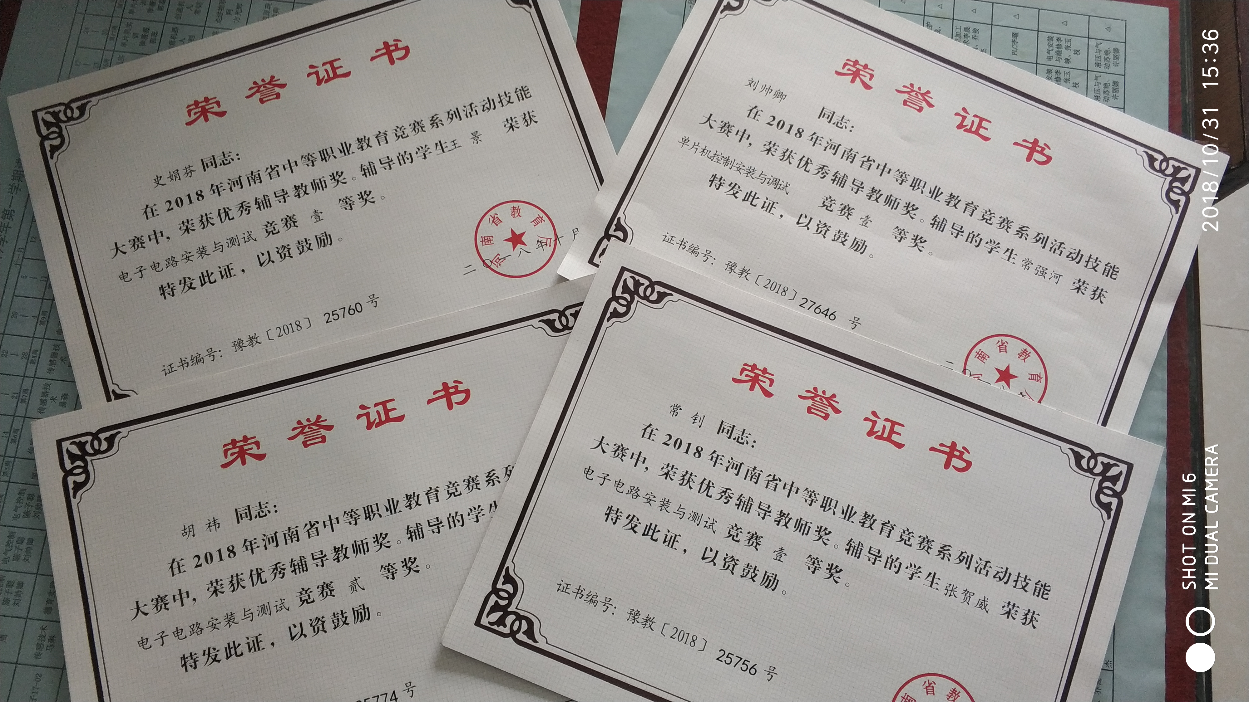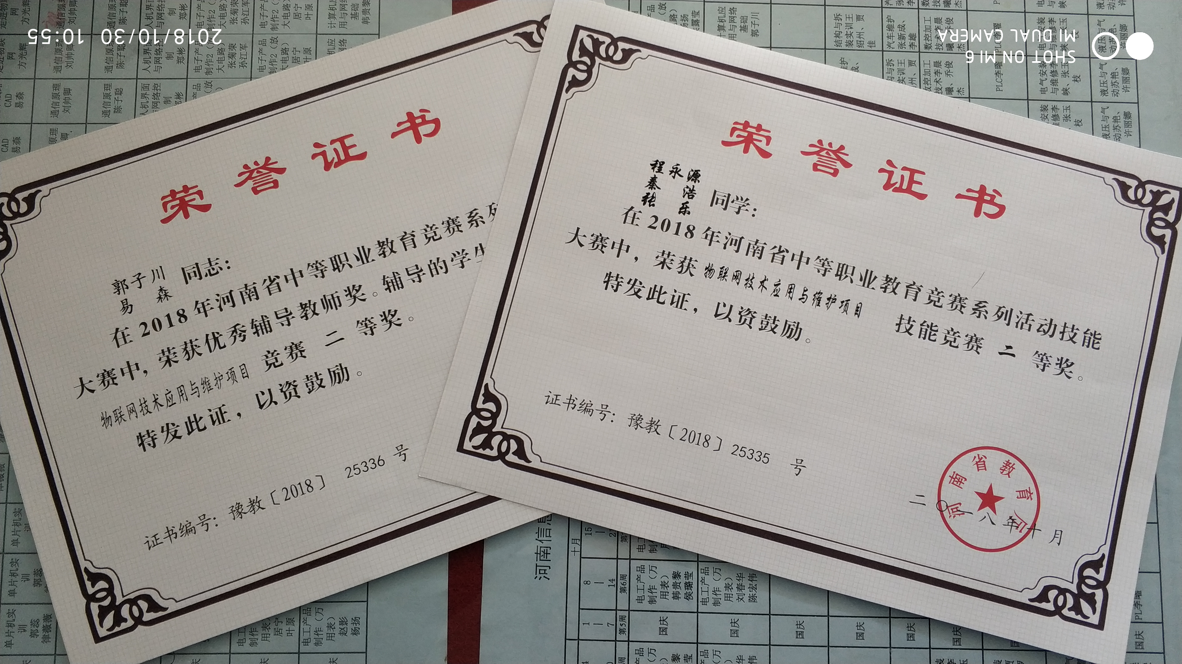 2018年10月,2018年河南省中等职业教育技能大赛正式开幕。我校电子工程系选派10名选手组成2018年技能大赛参赛队,参加了电子电路安装与测试(全员化试点项目)、 单片机控制装置安装与调试、制冷与空调设备组装与调试、物联网技术应用与维护等四个赛项,共获得个人赛一等奖五个和二等奖两个,小组赛二等奖一个。史娟芬、胡祎、常钊、郭蕊、郑彬、张菊荣、郭子川、易森、刘帅卿等九名辅导老师均获得优秀辅导教师奖!