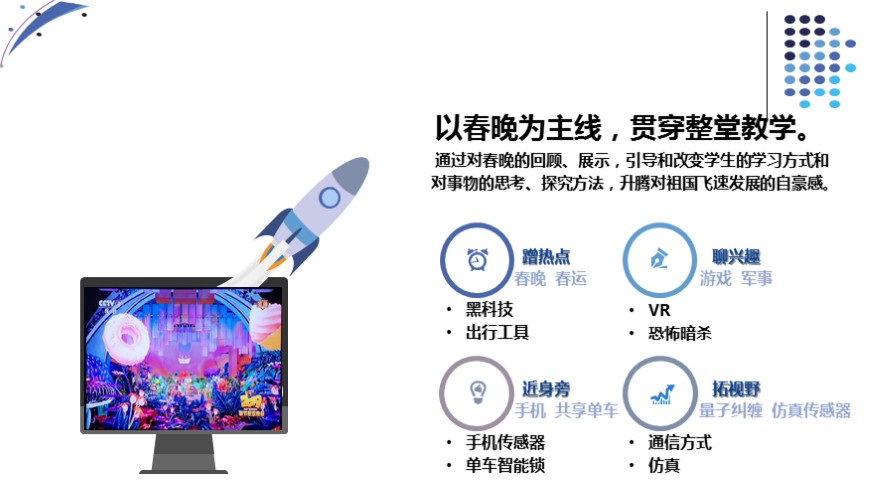 新学期开学时,学生注意力往往还没集中起来,如何集中学生注意力。彭老师建议在开学第一课上从“蹭热点、感兴趣、近身旁、拓视野”四个方面改变学生学习方式,将学生的注意力转移到学习上来。通过回顾春晚现场所用场景,与所学知识点结合起来,改变学生对事物的探究、思考方式。通过展现我国前沿科技成果,升腾学生对祖国飞速发展的自豪感,传达“工匠精神”,将德育融入日常教学活动中。