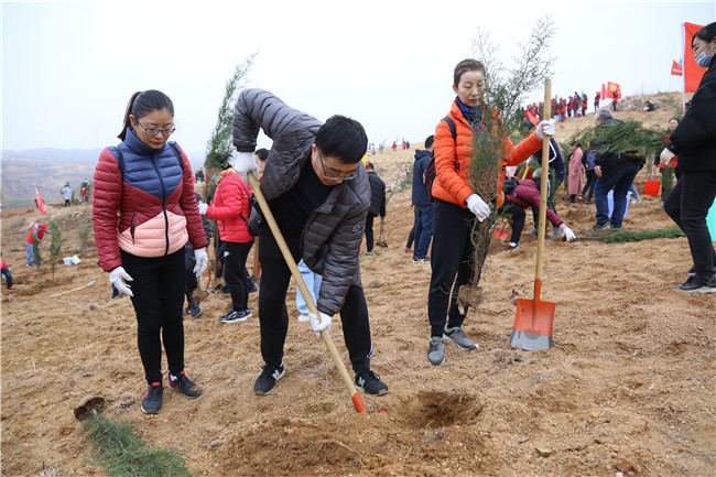 挖坑、竖苗、填土、浇水、定根,挥锹扬锄,干劲十足,一棵棵树苗稳稳地扎进土里。