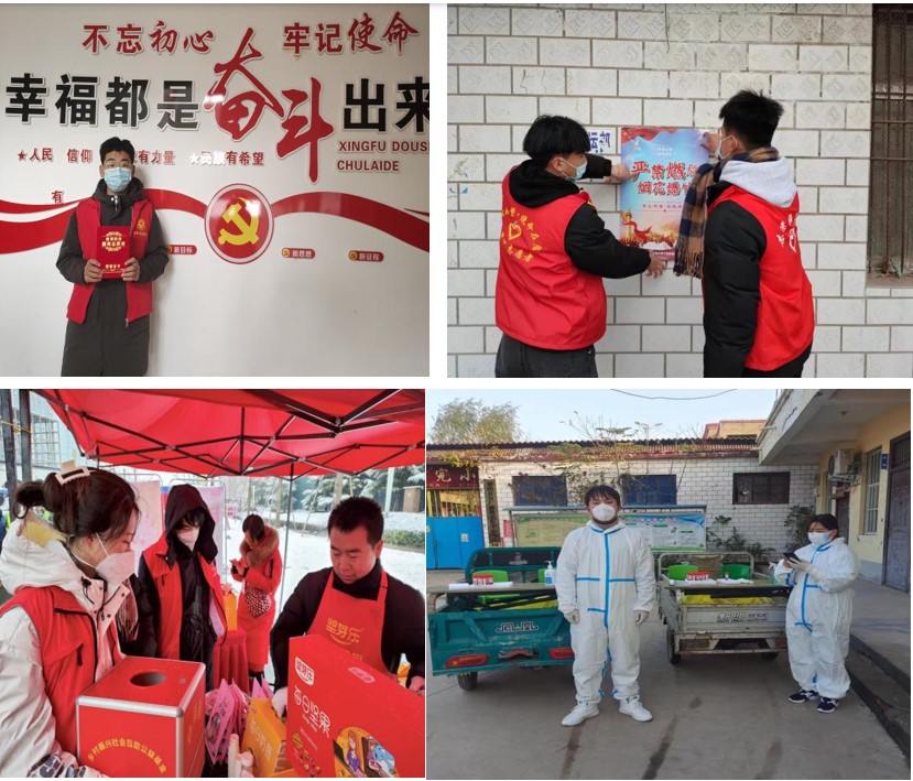 软件系熊梓昂、艺术系牛薪茹、郭子豪、资环系杜德财等同学主动向社区(村)报到、参与城乡基层防护网络,把投身疫情防控作为共青团员彰显先进的重要实践载体,深入开展“青”心聚力,基层有我——返乡大学生向社区(村)报到系列活动,在疫情防控志愿服务、乡村振兴实践中充分发挥共青团生力军和突击队作用。安全系任冠霖在香港帮助老人打扫卫生,向当地群众宣传二十大会议精神。机电系贾麒辉疫情期间给居家返乡人员做上门核酸,与村干部等人慰问常年不在家的“单亲老人”,在卫辉燃放烟火活动中维持秩序,维护市民安全,积极参加社区活动。