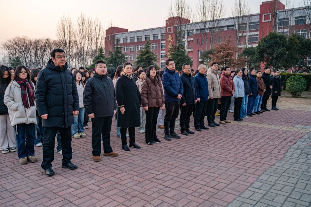 伴随着初升的朝阳,升旗仪式正式拉开帷幕。黄磊为国旗护卫队授旗。随后,国旗护卫队迈着铿锵有力的步伐护送国旗走向升旗台,在雄壮的国歌声中,五星红旗冉冉升起,全体师生庄严肃立,向国旗行注目礼,表达对祖国的无限热爱和崇高敬意。
