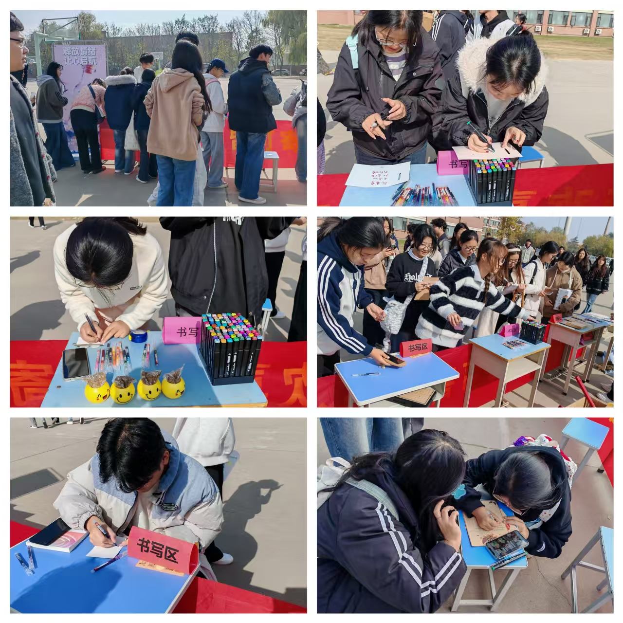活动现场气氛热烈,学生参与度空前高涨。在“情绪漂流瓶”区域,同学们借助精美的便签纸,真诚地书写下自己的喜怒哀乐,无论是学业上的压力、人际交往的困惑,还是生活中的小确幸,都将之安放于“漂流瓶”中。这一过程为学生们提供了一个安全、匿名的情绪释放窗口,有效帮助他们进行自我觉察与情绪疏导。许多同学表示“写下来之后,心里轻松了很多”