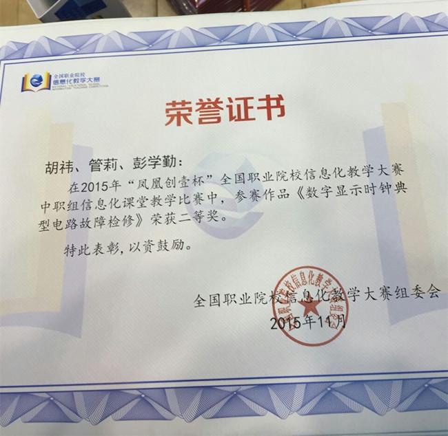 由教育部主办、教育部职业院校信息化教学指导委员会承办的2015年全国职业院校信息化教学大赛决赛近日在南京举行。河南信息工程学校教师胡祎、管莉、彭学勤组建的教学团队代表河南省参赛,经过紧张激烈的角逐,参赛作品《数字显示时钟典型电路故障检修》在众多参赛教师作品中脱颖而出,荣获全国职业院校信息化教学大赛中职组信息化课堂教学比赛二等奖。