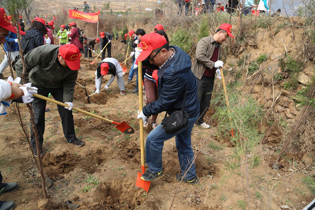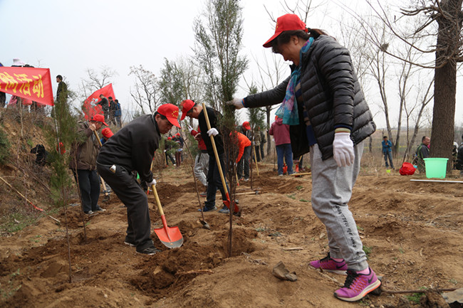 上午10时许,志愿者们到达指定植树地点。远远望去,山脚下人头攒动、红旗飘扬、横幅高挂,大家顿时忘记了路途疲惫,兴高采烈地加入到植树大军中,按照划分区域,手拿植树工具,挥锹铲土,镐头深刨,移树栽苗,灌溉浇水。志愿者三五一组,男女搭配,相互协作,从挖坑整地、栽植树苗,到扶正压实,各道工序一丝不苟,整个植树现场呈现一派热火朝天的劳动景象。经过两个多小时热烈有序的植树劳动,共栽植松柏苗近百株,为植树基地又增添一抹亮丽的新绿。