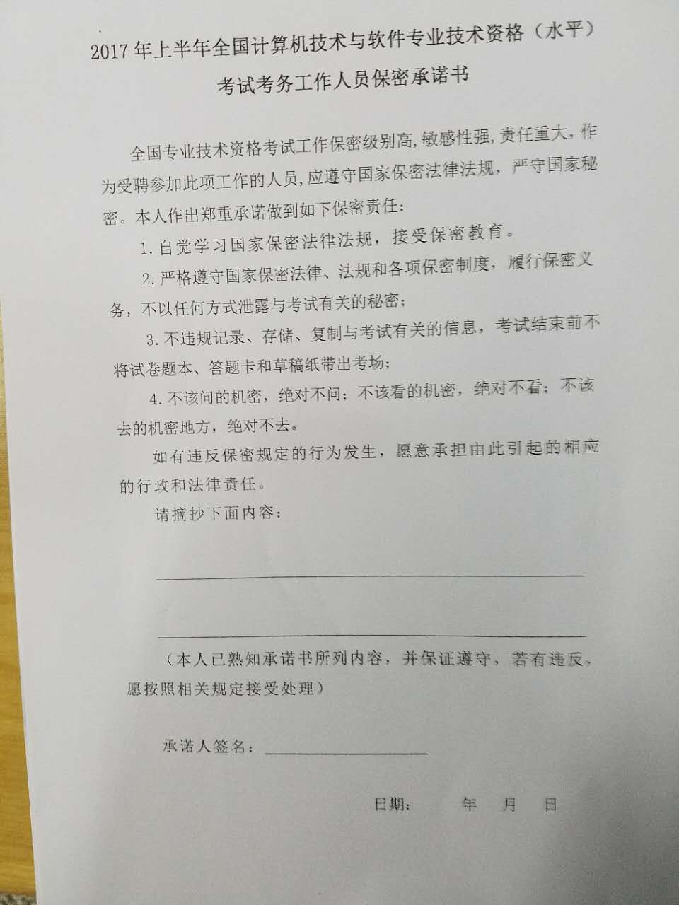 本次培训的内容主要是试卷的管理分配和押送以及上机工作的流程要点。同时对所有参加考试外围工作的人员签订了保密承诺书,要求每一个成员都要做到认真对待考试,坚决保守秘密,不影响考试的正常进行。