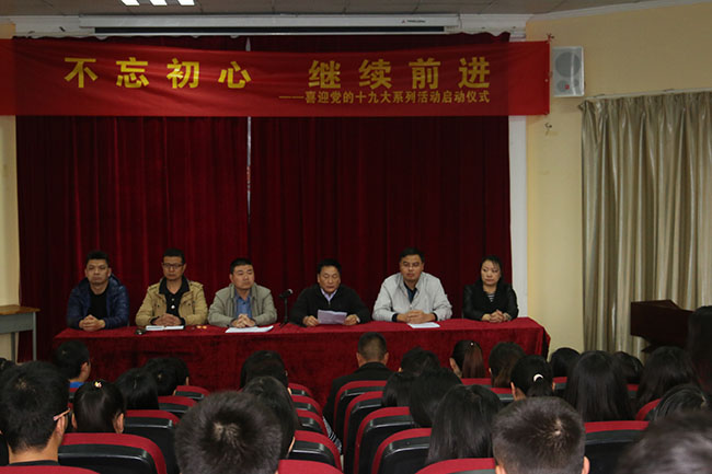 在党的十九大即将召开之际,2017年10月10日下午,学生处(团委)在道德讲堂隆重举行“不忘初心 继续前进——喜迎党的十九大系列活动”启动仪式。宋廷楷副校长、学生处(团委)中层干部、全体班主任以及学生干部参加了启动仪式,仪式由张凯处长主持。