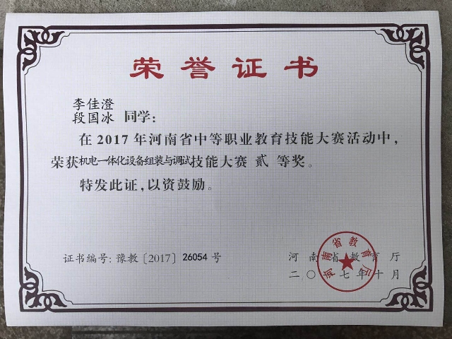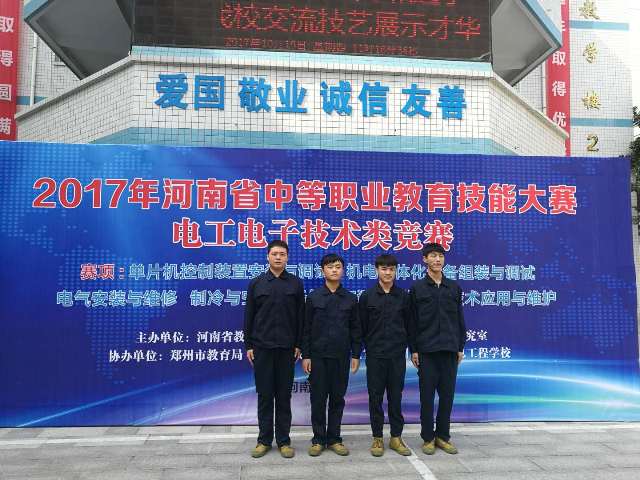根据《关于举办2017年河南省中等职业教育技能大赛的通知》文件精神,河南省中等职业教育技能大赛电工电子技术类比赛于2017年10月18-20日在郑州市电子信息工程学校进行,我系参加《电气安装与维修》和《机电一体化设备组装与调试》两个赛项并喜获一等奖和二等奖。