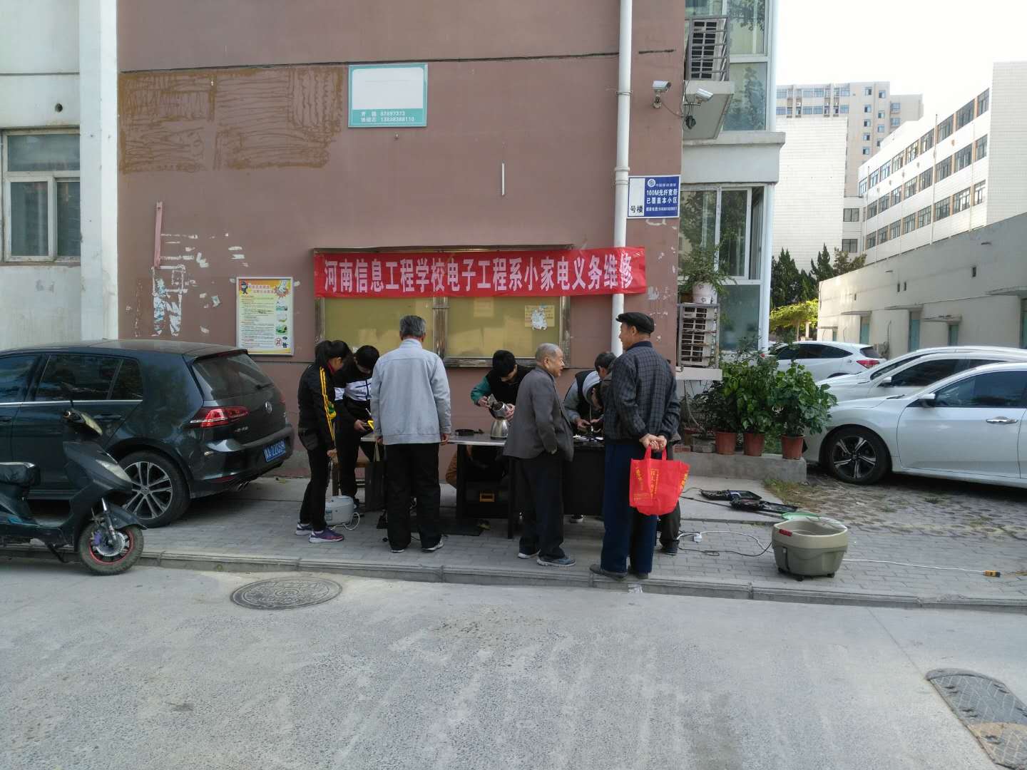 2017年10月28日上午,我校电子工程系老师带领电子协会16级会员来到我校家属院举行小家电义务维修活动。本次义务维修活动受到小区业主们的欢迎,大家纷纷把家中需要维修的电器交到学生手中。同学们热情的接过电器,在老师的指导下马上动手维修起来,并耐心的为老百姓讲解。同学们认真负责的工作态度赢得家属院居民的高度赞扬。