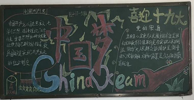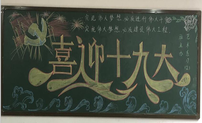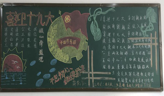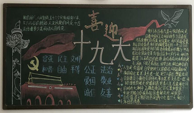 为了充分黑板报文化宣传阵地的重要作用,2017年10月23 -27日,我校举行“喜迎十九大”主题黑板报比赛。此次比赛以“不忘初心继续前进”“中国梦”“核心价值观记心中”等为主题,各班积极参与。在比赛中各班的人才采用描画、书写等多种手段,一展身手,在规定时间内拿出了各具特色的作品。
