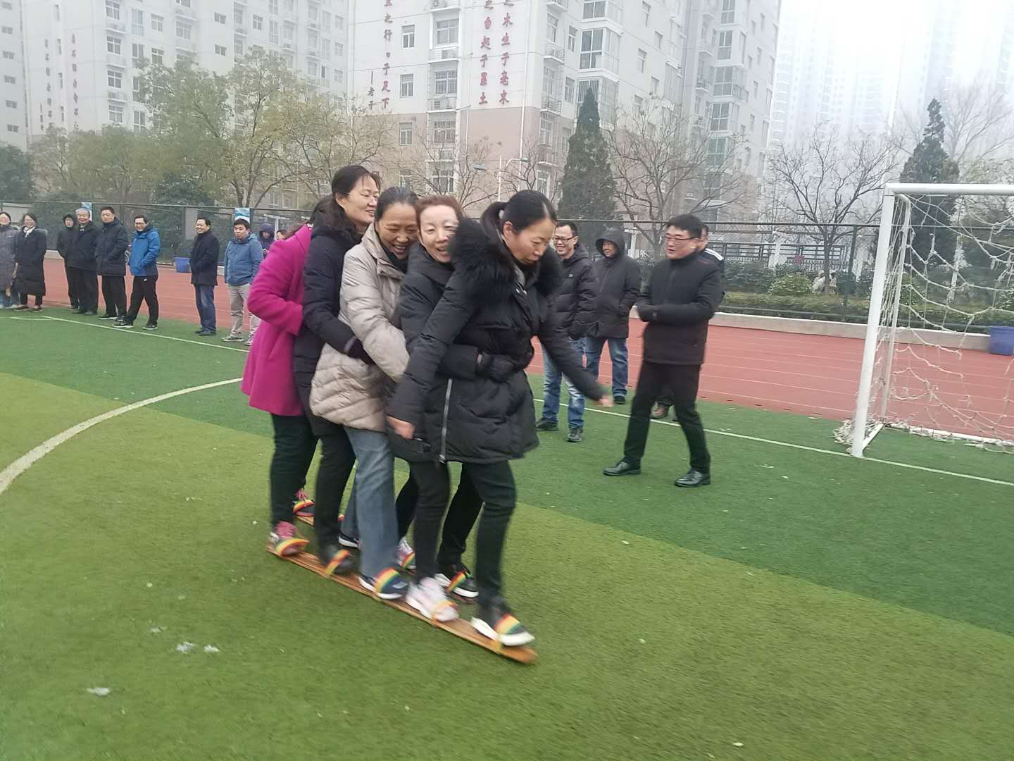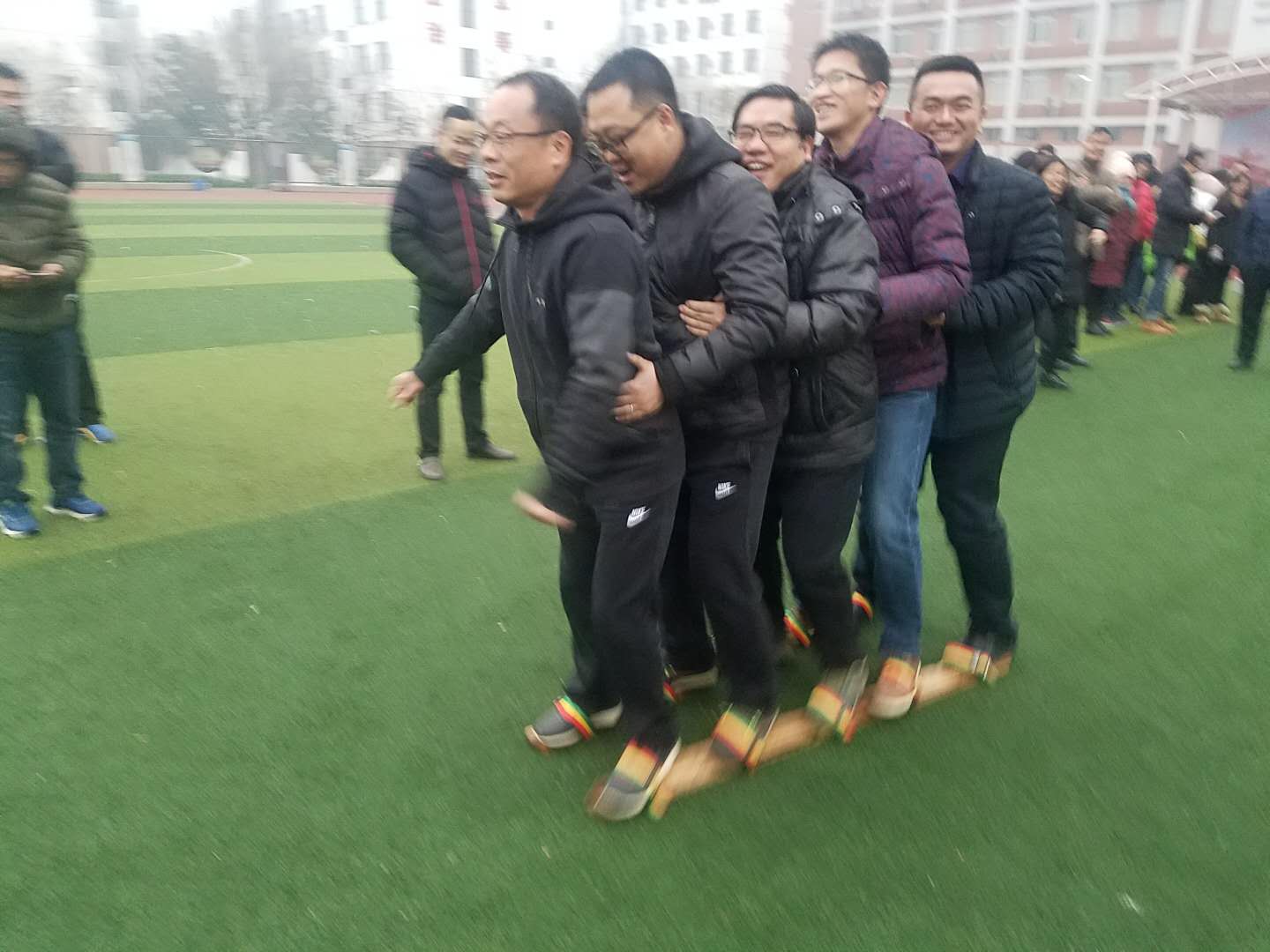 今天是学校进行趣味运动会的最后一天,虽然天气比较寒冷,但是大家也都热情满怀的来到了运动场上,培训中心和教务处联队今天参加的是同舟共济的比赛,就是每一组五个队员共同踏在两个木板上,大家一起向前走动,保证每一个队员都要保持平衡,共同到达终点。