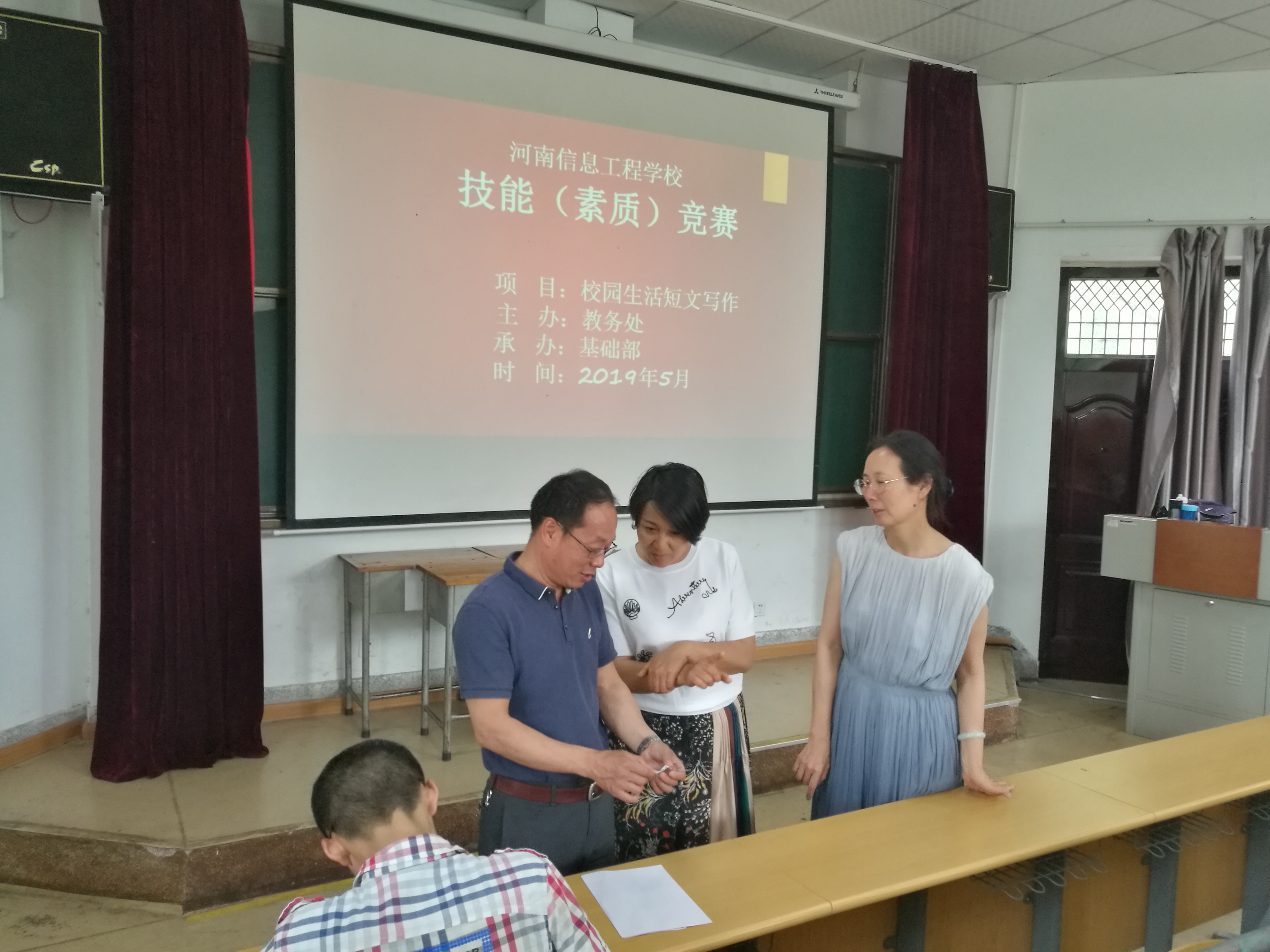 2019年5月28日下午,基础部在八角楼大屏教室、教学楼117、217教室及实训楼形体教室成功组织了2019年度河南信息工程学校学生技能(素质)竞赛的素质类竞赛。本次竞赛共设5个赛项,德育教研室组织了模拟应聘、语文教研室组织了校园生活短文写作、读书与训练故事,体育教研室组织了健美操、数学教研室组织了数学基础知识应用竞赛。