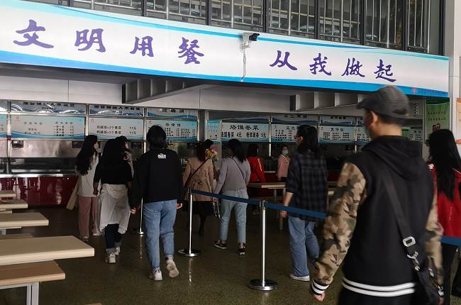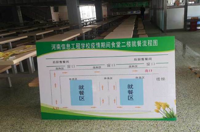 食堂管理处对学校食堂进行了消毒杀菌和重新布置,在入口处设防疫宣传栏发布学生就餐流程图,并将行进间距标识、就餐座位标识粘贴到位。食堂管理处全体工作人员配合学生处进行了学生就餐演练。