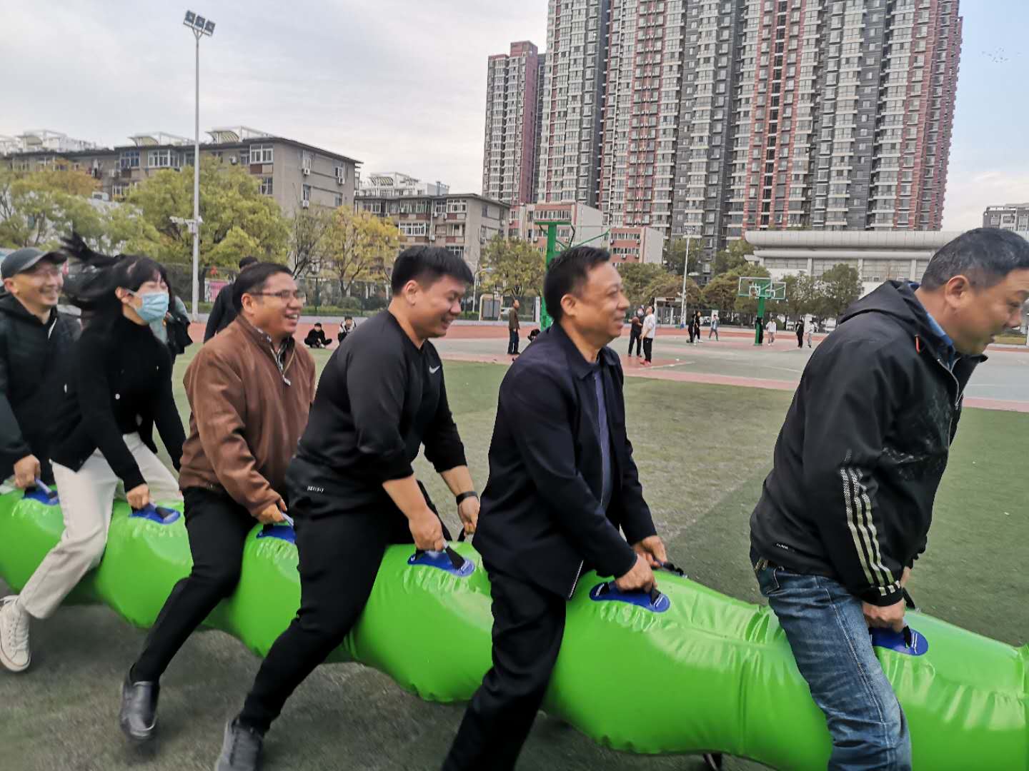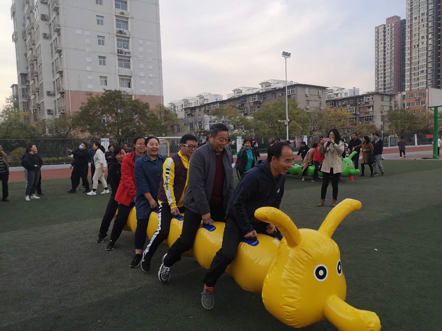 另外一个项目是5人毛毛虫,5个人共同提着长毛毛虫前进,每方由两个小组组成,用时少者为胜,规划发展处全体参加,虽然我们成绩没有兄弟科室好,但大家也十分快乐,达到了锻炼身体,增进团结的目的。