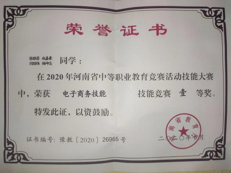 10月17日上午,2020年河南省中职教育技能大赛电子商务技能赛项在郑州市商贸管理学校举办,经过激烈的比赛,我系学生张雅菲、赵嘉豪、闫昭伟、杨坤志四名同学获得团体一等奖的优异成绩。辅导老师尹顺丽、白一卓两位教师获得“优秀辅导教师”称号。