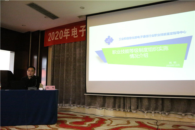 工业和信息化部教育与考试中心鉴定处处长姚明做了《职业技能等级制度组织实施情况介绍》的报告,对制度进展、备案管理、证书管理、工作规程等内容进行了详细讲解,并对职业技能鉴定向职业技能等级认定转变和过度的背景和相关政策进行了解读。