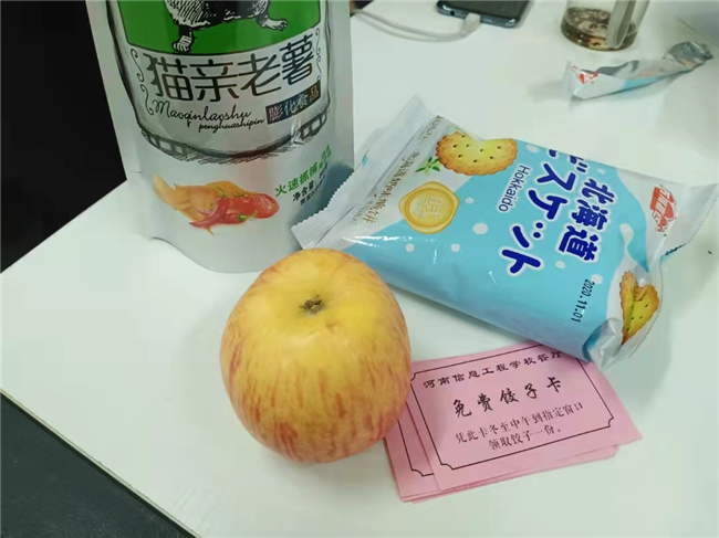 12月20-21日,我校开展“情暖冬至 传承文化”活动,为本部、南三环校区、航空港校区三个校区学生发放零食、苹果和饺子餐券。