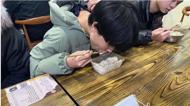 冬至当天中午,学生一下课便赶到食堂,在食堂排起了领取饺子的长队。食堂里香气四溢,热气腾腾的饺子出锅了。端上了热乎乎的饺子,学生们迫不及待地拿起筷子品尝。传统的猪肉大葱馅儿饺子,让学生吃出了家的味道。