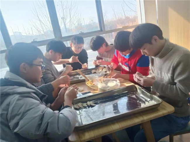 老师和学生一起包饺子,其乐融融