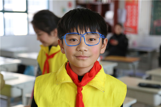学生开心地展示自己做好的眼镜框