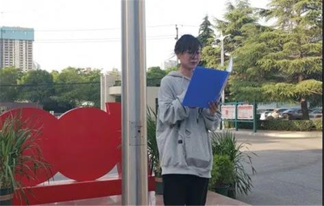 礼毕,由艺术系20级2班的团员代表朱冰冰进行了国旗下的演讲。她以《学党史、颂党恩》为主题,赞颂中国共产党历经百年的艰苦奋战,团结与带领全国各族人民破壁图强、砥砺奋进,同心同德、艰苦奋斗,建设了新中国,成就了泱泱华夏焕然风貌的丰功伟业。