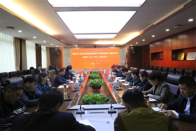 2021年4月20日,郑州工业安全职业学院和河南信息工程学校召开党委理论学习中心组(扩大)学习会议。学校六楼会议室设主会场,学院一楼会议室设分会场。两校领导班子和全体中层干部参加了会议。黄磊校长主持会议。