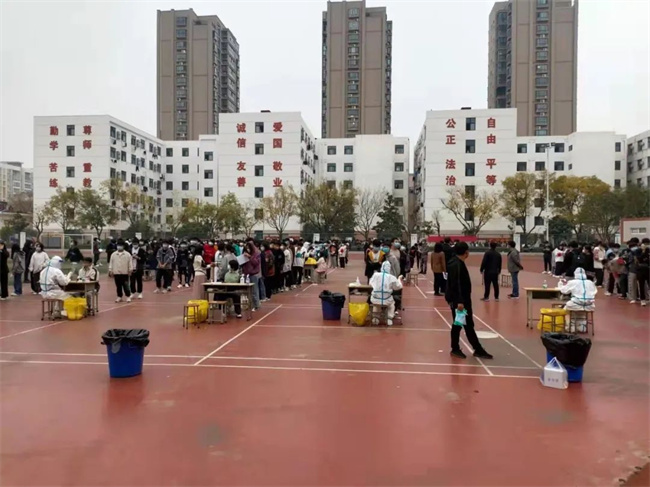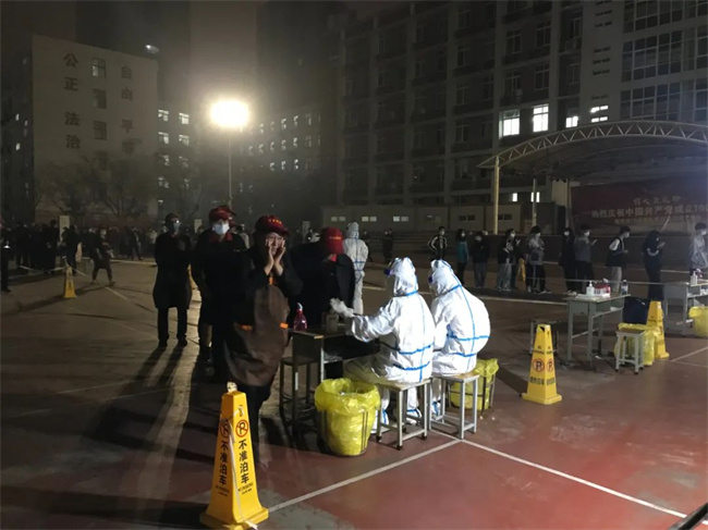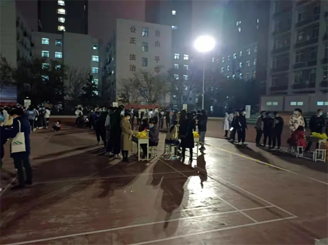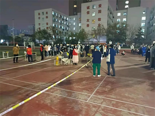 在学校领导和疫情防控办的统一指挥下,校本部检测共分8组,在学校操场同时进行。在检测现场,参检师生全程佩戴口罩,保持1米以上间隔,10人一组为单位排队等候检测。采样现场实行单口进入、单口离开、人员不交叉的原则。采样完毕后,师生按照标识从出口处离开检测点,减少人员聚集。直至晚上22:30分,全校师生全部检测完毕,圆满完成检测任务。对不能到现场检测的个别教职工按照要求当天到就近医院检测,并将检测结果报学校疫情防控办。