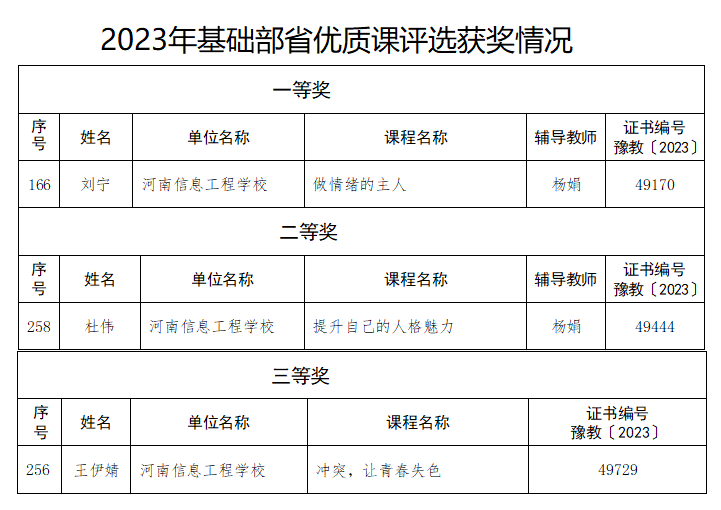 基础部刘宁、杜伟、王伊婧三位老师因在学校优质课比赛中成绩优异,被推选代表学校参加教育厅组织的2023年河南省中等职业学校优质课比赛。最终,在学校的大力支持和三位老师的辛勤努力下,刘宁、杜伟、王伊婧三位老师分别荣获省优质课比赛一二三等奖。