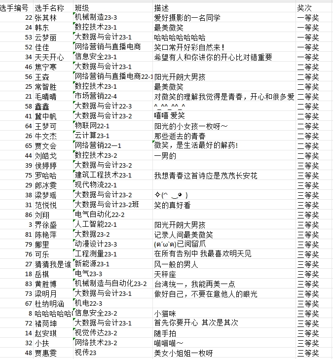 同学们的微笑照片纷纷汇聚线上平台,开启了一场别开生面的创意评选。投票页面人气爆棚,同学们呼朋唤友,为心仪的微笑助力,评论区更是热闹非凡。有人为照片中的自信风采点赞:“这笑容太有感染力了,每次看到都感觉自己也充满能量,冲鸭!”还有人被照片背后的故事打动:“知道这位同学克服了很多困难才有了今天的笑容,为他骄傲,必须投一票!”评选活动如同纽带,将原本陌生的同学紧密相连,跨越专业与年级界限,分享着彼此的喜悦与感动。历经数日激烈角逐,本次活动共有82名选手参加,点赞数达到20242个,访问量达到225318次,最终评选出35名“微笑之星”。