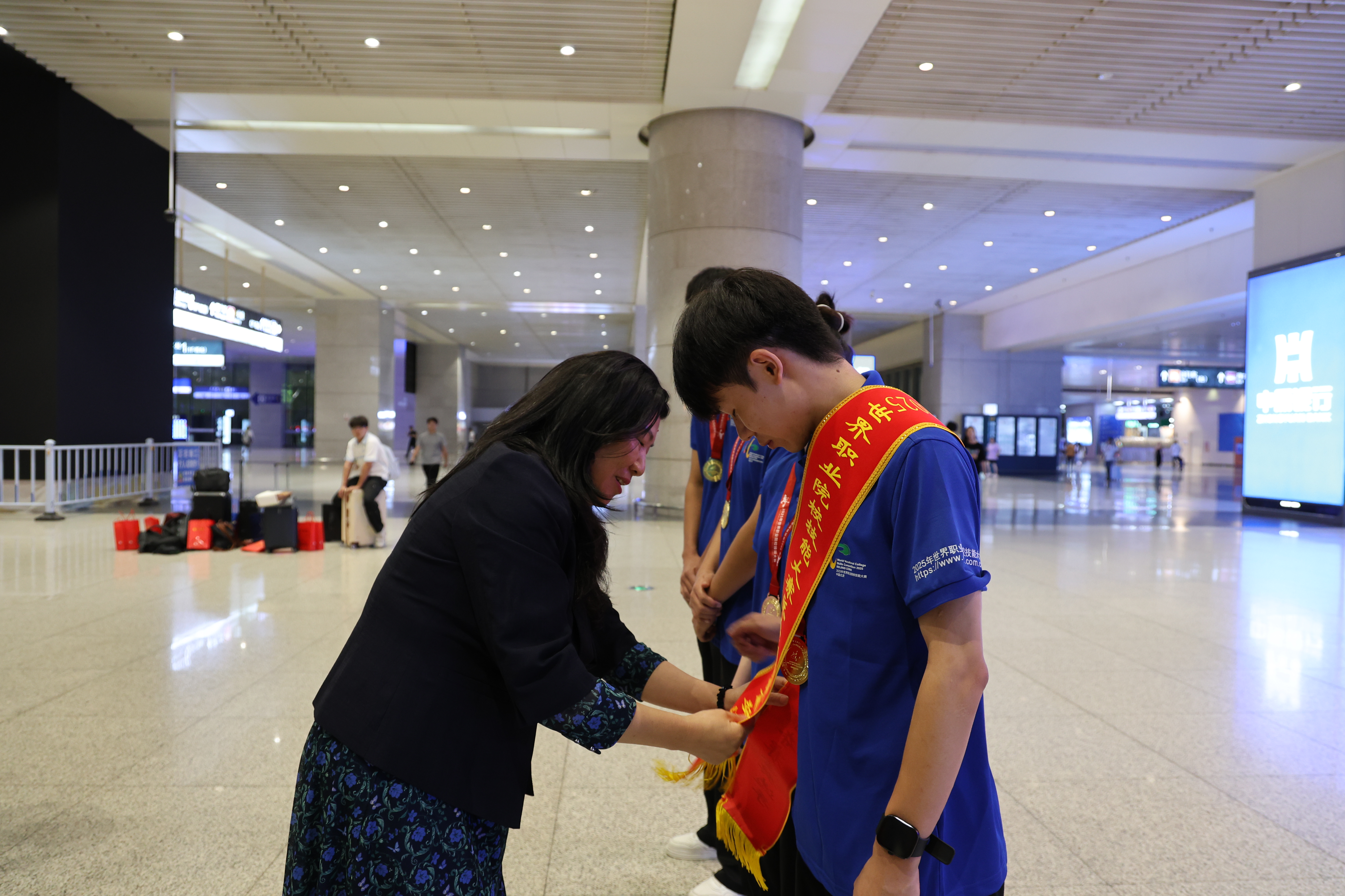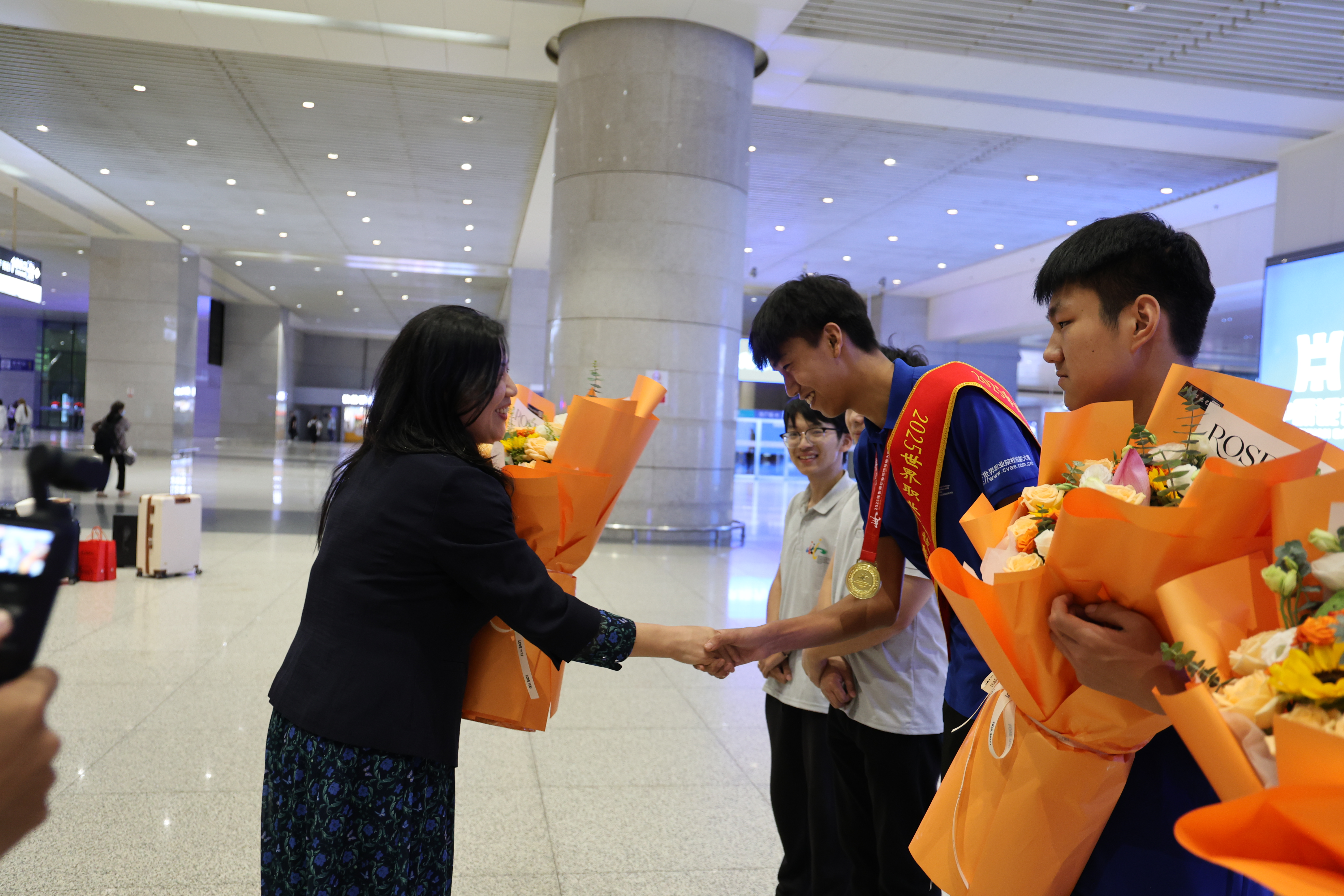 捷报传来之际,我校党委书记黄磊专程亲临颁奖现场,向参赛团队与指导教师致以热烈祝贺,并送上诚挚慰问。9月8日下午,校领导带队前往高铁站迎接参赛师生凯旋归来,黄磊亲自上前送上鲜花,与团队师生一一握手并亲切交流,对他们的辛勤付出和取得的优异成绩再次表示热烈的祝贺和衷心的感谢。