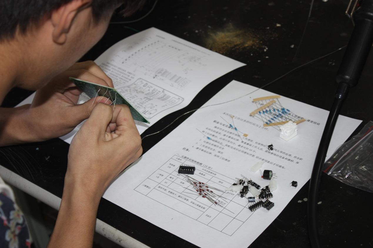 作为本学期第二课堂活动中的一项,电子产品装配与调试借鉴国家技能竞赛的部分内容,遵循同样的评分标准,考察学生的元器件识别检测、焊接装配、调试维修的能力,竞赛前由电子协会在校园和班级进行了广泛的宣传,比赛中学生们遵守操作规范,认真装配,80%的学生基本完成了装配任务,60%同学的电子产品实现了功能。