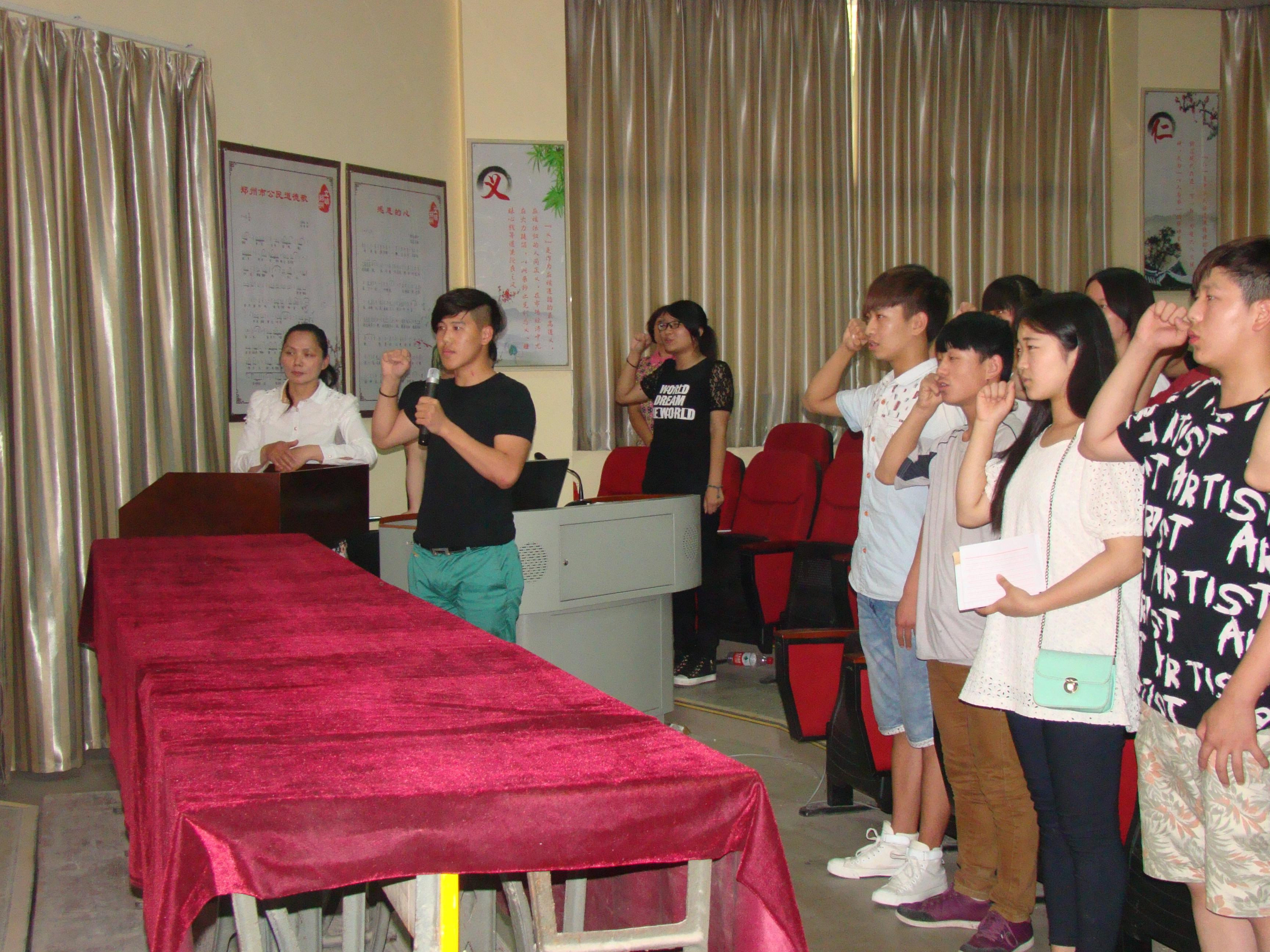 20位新团员和40多位老团员一起,面对鲜艳团旗,举起右手庄严宣誓:"我志愿加入中国共产主义青年团,坚决拥护中国共产党的领导,遵守团的章程……为共产主义而奋斗。" 青春誓言、高昂雄浑,表达了同学们对共青团组织的向往和为团组织增光添彩的豪迈激情!