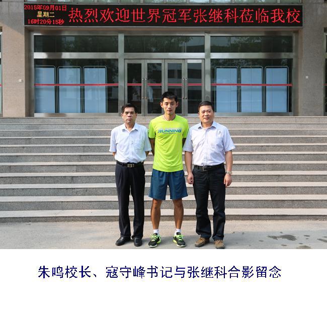 9月1日下午16时,我国著名运动员、世界冠军、乒乓球大满贯得主张继科来到我校短暂停留,与朱鸣校长、寇守峰书记进行了简单交流,并合影留念。